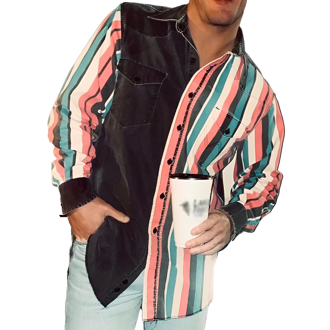 Męska Koszula Casual w Paski z Kolorowymi Blokami i Kołnierzykiem, Długi Rękaw 92383317Z