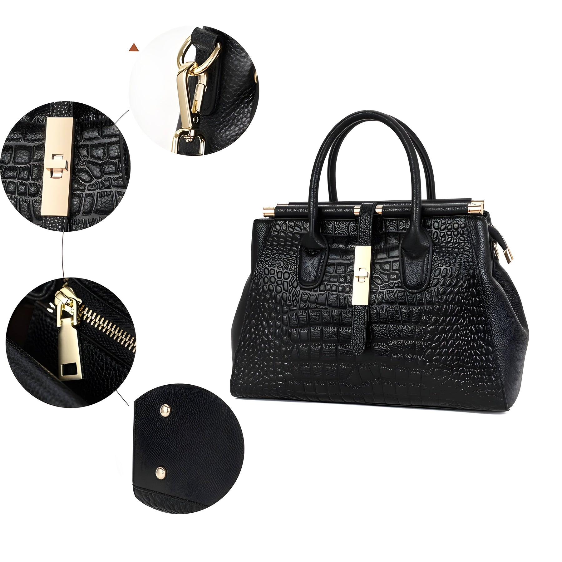 Elegancja spotyka się z wyrafinowaniem w tej misternie wykonanej torebce, która charakteryzuje się luksusowym tłoczonym wzorem aligatora na skórze bydlęcej najwyższej jakości. Strukturalny design jest zarówno nowoczesny, jak i ponadczasowy, a złocona zapięcie magnetyczne dodaje odważnego kontrastu w stosunku do gładkiego czarnego wykończenia, podkreślając jej szykowny urok.