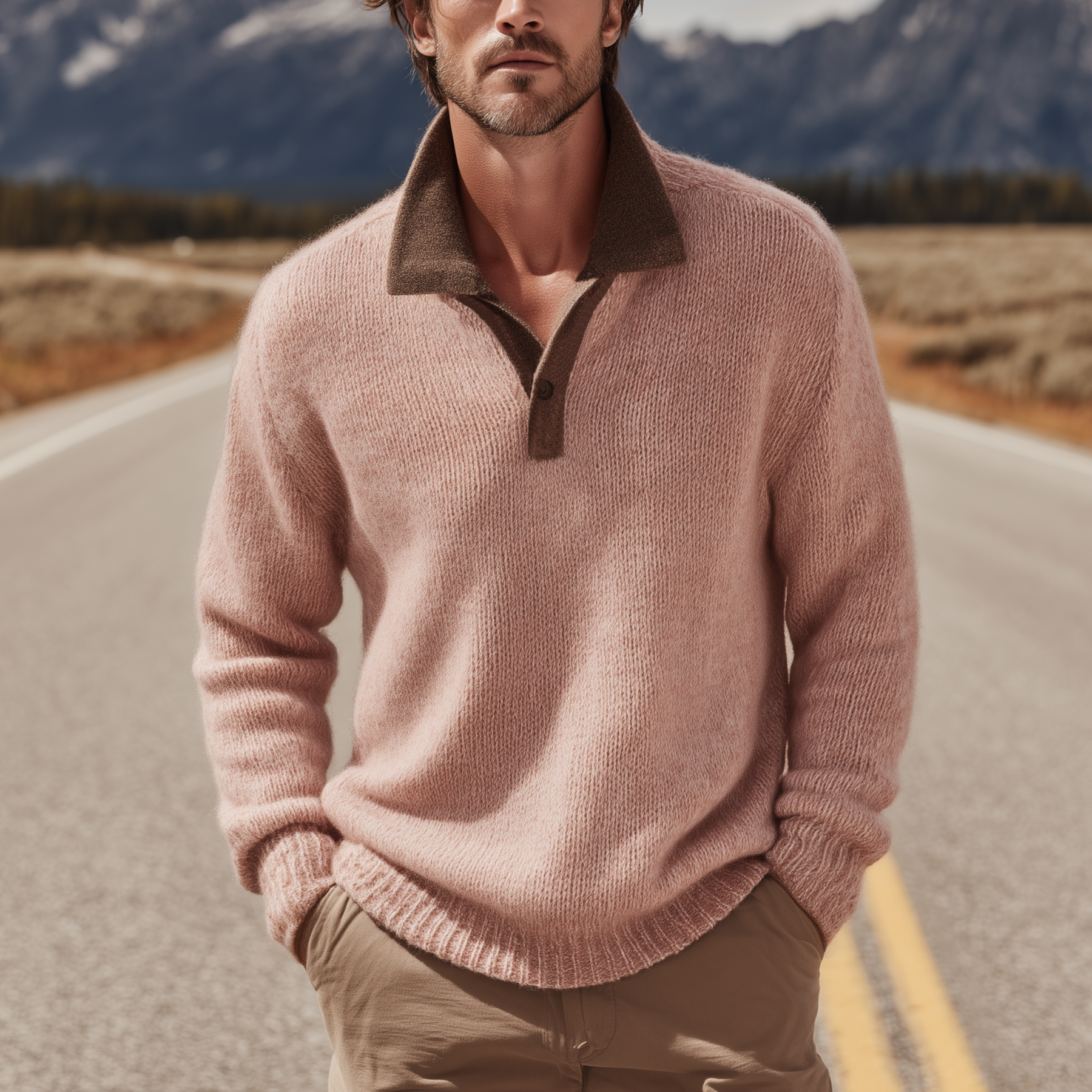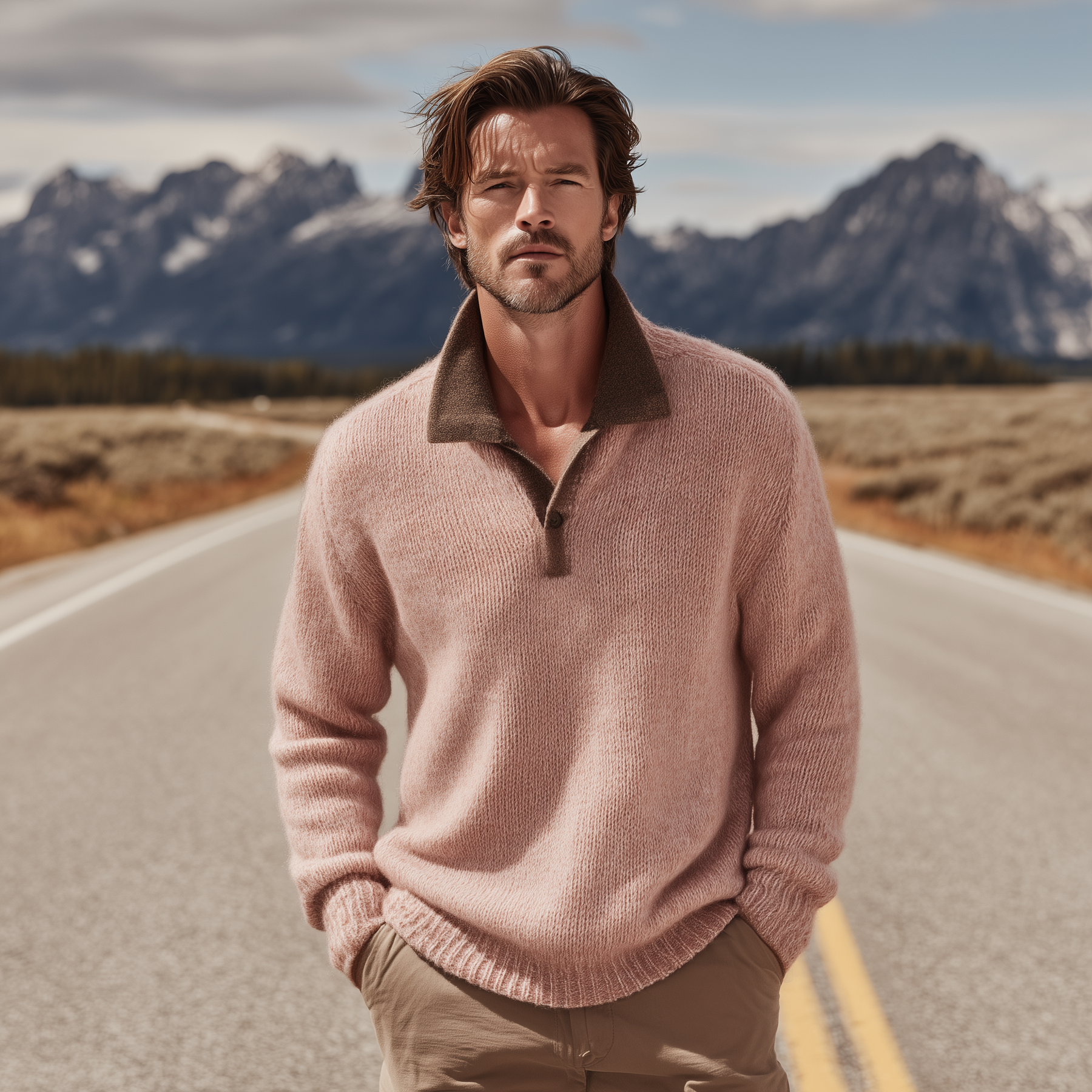 Męski klasyczny casualowy sweter z kołnierzykiem w kontrastowym kolorze różowym łączy wygodny zewnętrzny materiał dzianinowy z wyrafinowanym kołnierzem inspirowanym klapami i detalami w kontrastowym kolorze. Jego trwała konstrukcja, oddychająca ciepłota i wszechstronny styl oferują wyjątkowy element, który łączy swobodną wygodę z eleganckimi detalami na różne okazje.