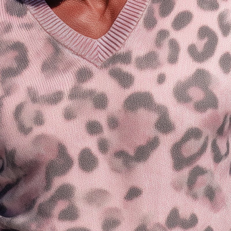 Ten sweter w wzór lamparta można zestawić z jednokolorowymi spodniami lub dżinsami, aby zrównoważyć odważny wzór. Dla eleganckiego wyglądu połącz go z białą koszulą i uzupełnij klasycznym zegarkiem lub casualowymi trampkami.