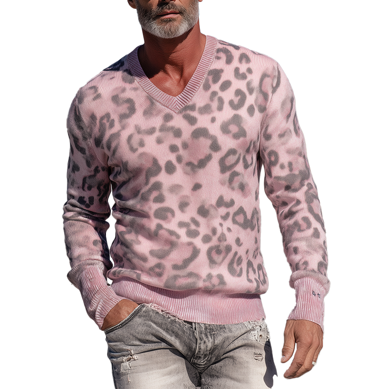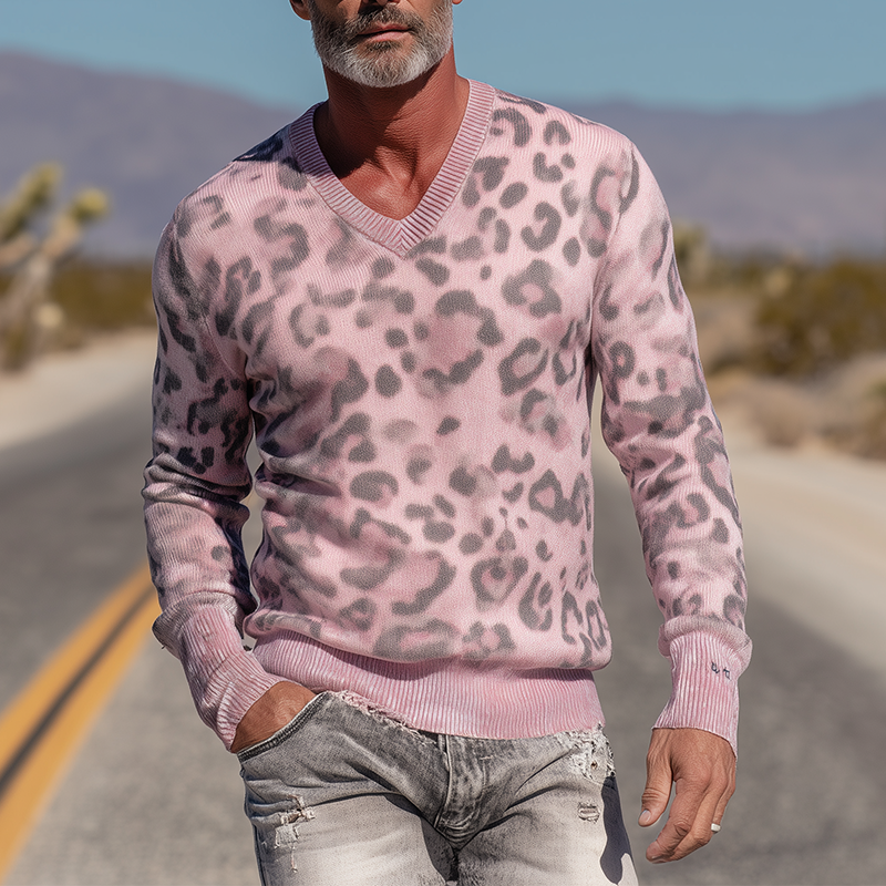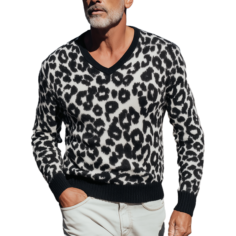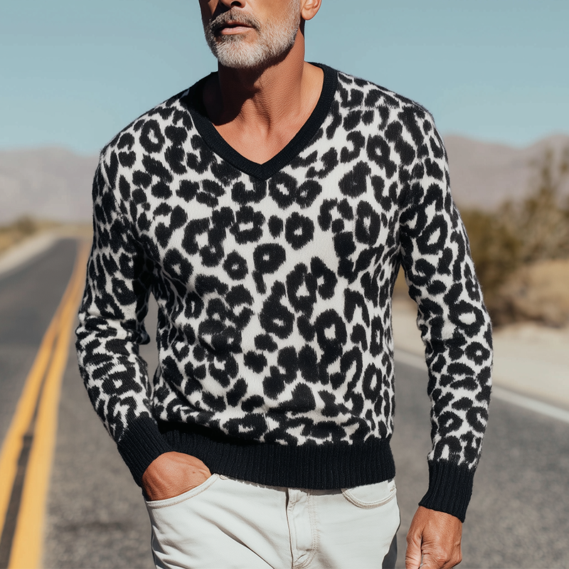 Męski Vintage Sweter z Dzianiny w Wzór Lamparta z Dekoltem w Serek MTA1437H0P